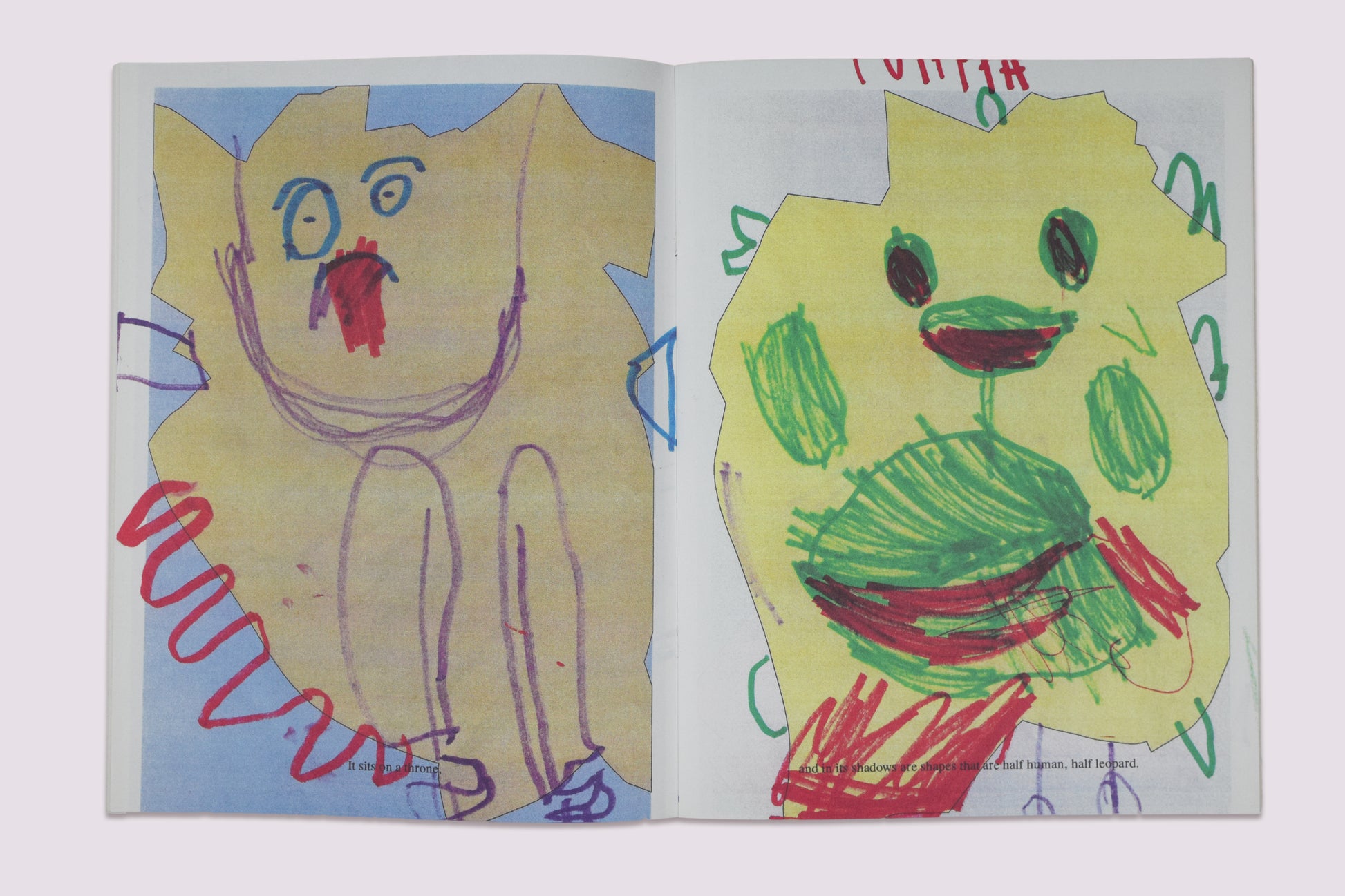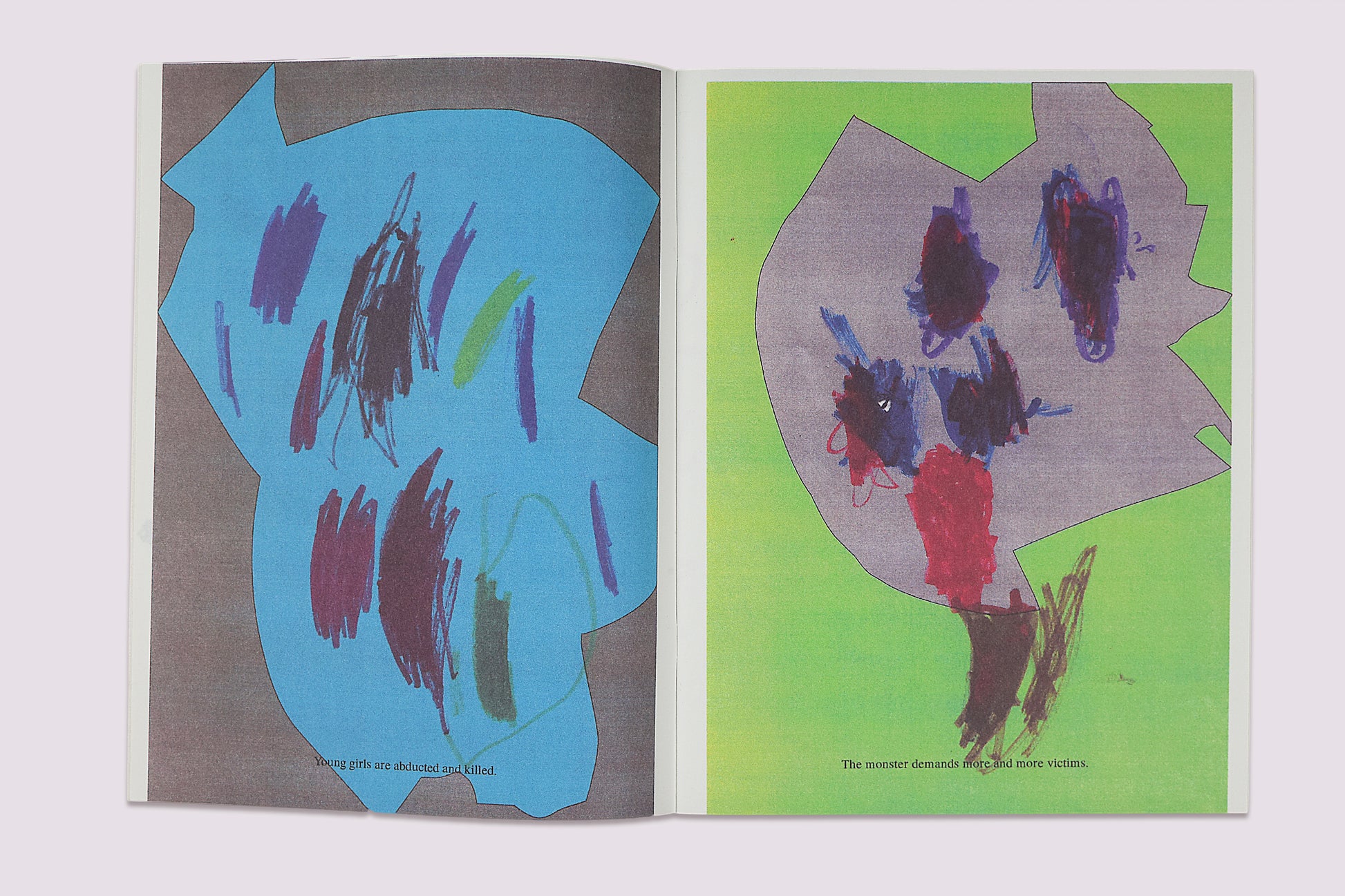 A series of children’s drawings tells the short story of a girl who, through an act of metamorphosis, saves a village from a tyrannous monster. As the story abstractly concludes her transformation into the idea of authorship, the book itself simultaneously raises questions about its own authorship. The text was borrowed by artist Mijia Wang from subtitles from the film Erzählen (1975). In response to the work Bird shaped vinyl by Kai Udema — a series of shapes from broken windows — she invited a class of toddlers to draw dragons onto copies of his collected shapes.