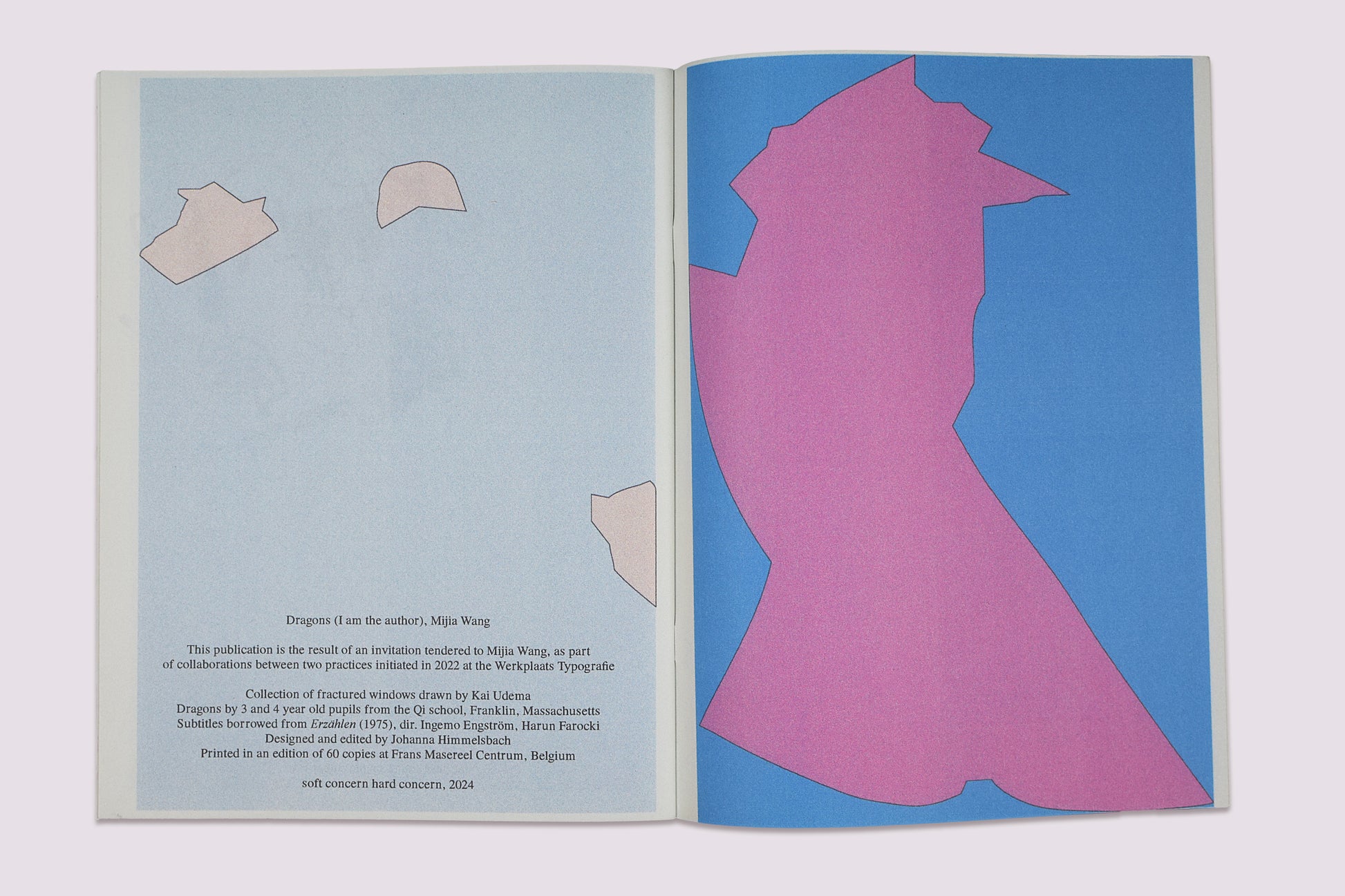 *本作は、Werkplaats Typografie(1998年にKarel MartensとWigger Biermaによって設立された2年間のグラフィックデザイン修士課程。オランダ公立ArtEZ芸術大学の一環であり、オランダのアーネムにある)におけるプロジェクトとして行われた。このプロジェクトはMijia WangとKai Udemaのコラボレーションである。Mijia Wangが借用した『Erzählen』(1975年)は「村が怪物に支配される」というSF的物語が含まれており、その“怪物”「ドラゴン」をマサチューセッツ州フランクリン、Qi学校の3歳と4歳の生徒たちが描いた。デザインと編集は、Johanna Himmelsbachによる。理想科学のComColor(インクジェット式印刷)でプリントされ、限定60部!