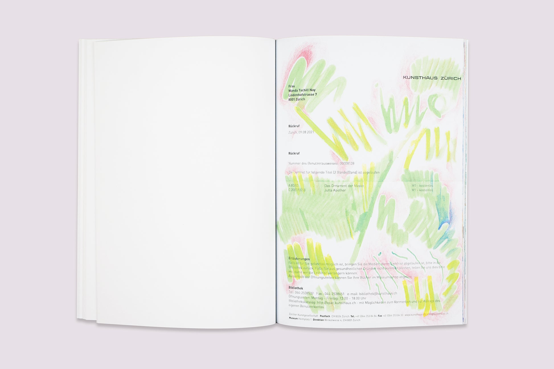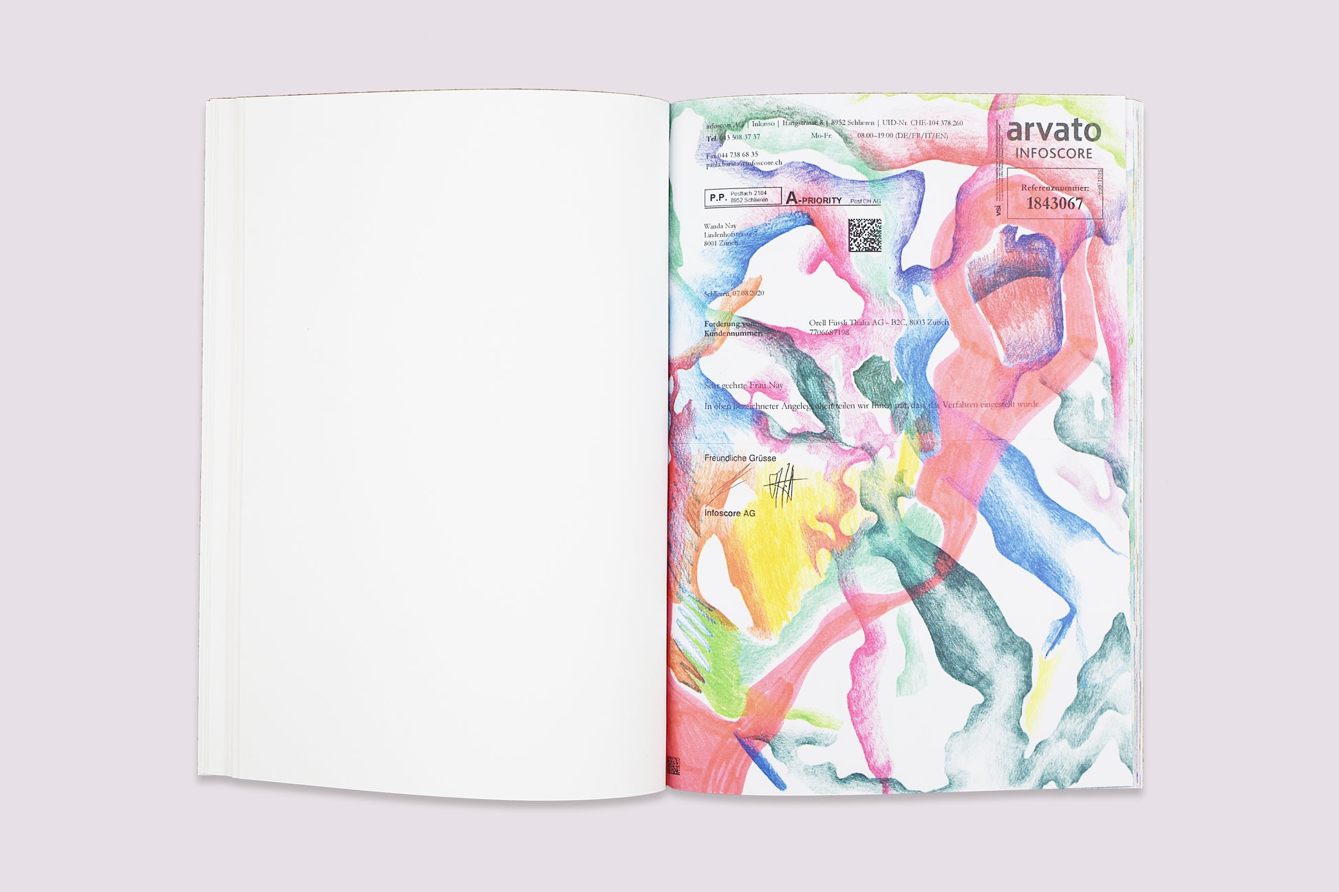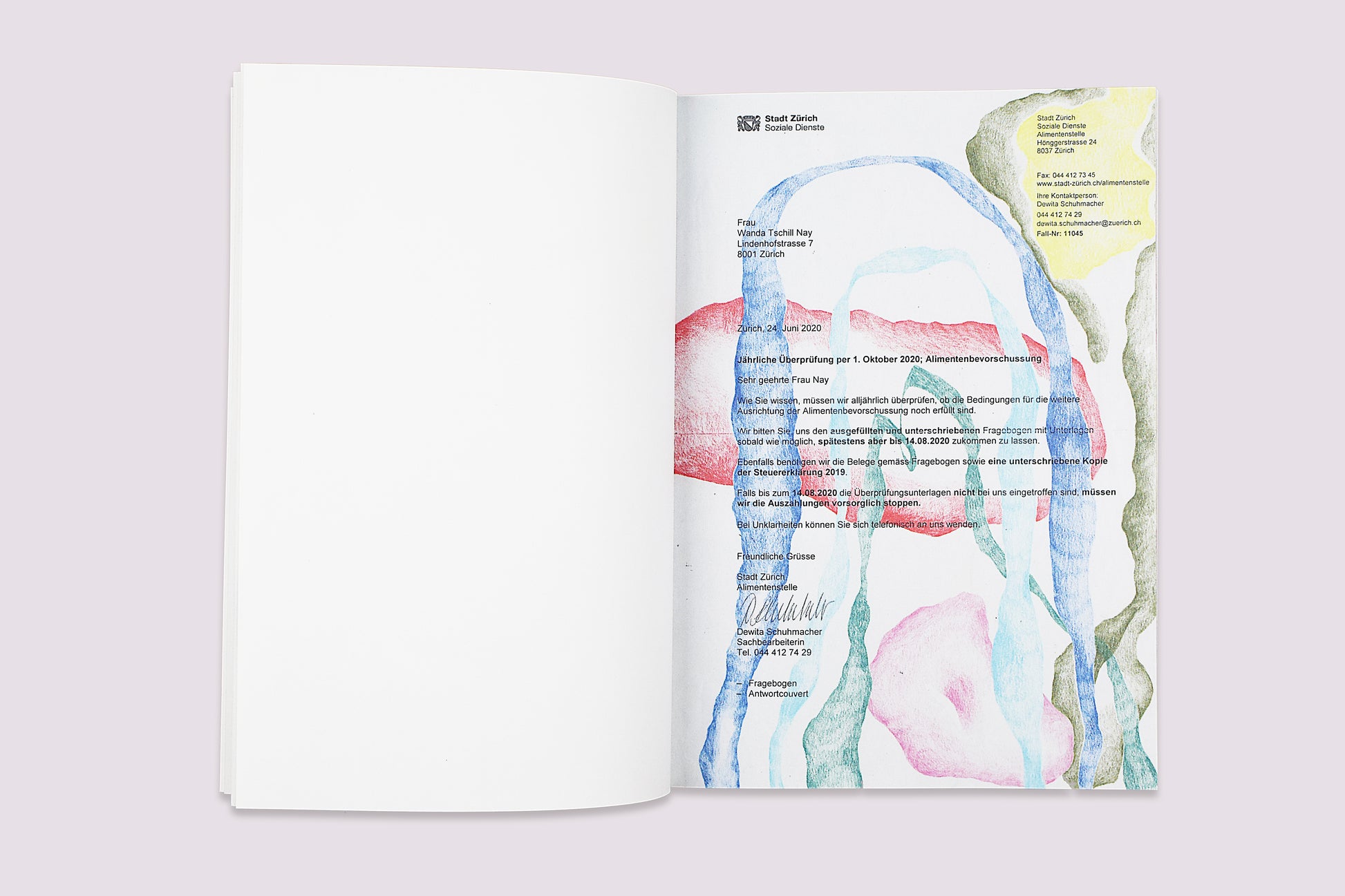 チューリッヒを拠点に活動するアーティスト、Wanda Nayは、その独特なドローイング作品を通して、個人的な表現と制度的なコントロールとの間の複雑な緊張感のある関係性を探求する。このシリーズでは、Nayが、主に色鉛筆を用い、官僚的な公文書(書式、証明書、申請書)の空白、空きスペースを躍動的で流れるような美的空間へと変貌させる。フェミニズム、心理学、社会政治的なレンズを通し、作品の根底にある古典的な概念『horror vacui(ラテン語で『空虚な空間への恐怖』を意味する)』を再解釈する。この美学は、偶発的なものではなく、行政システムの無言の暴力--アイデンティティはチェックボックスの選択肢に限定され、人生はテキストの行数に制限される--に対する反応を反映する。これらの文書に、ドローイングをすることで、彼女はそれらを消去するのではなく、むしろ視覚的な複雑さや過剰な表現を通して、一種の抗議を生み出す。