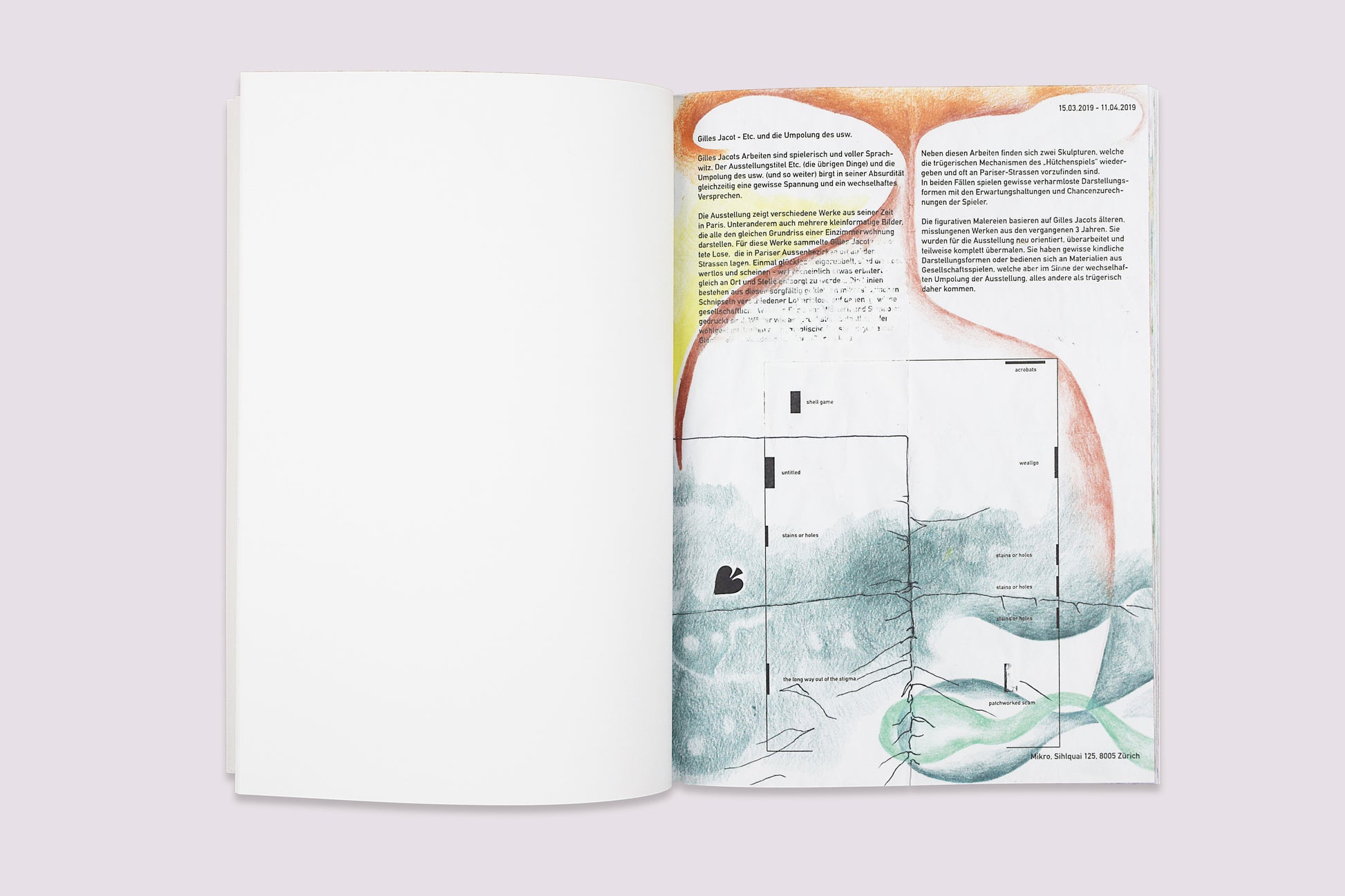遊び心のある色合いやリズミカルな筆致は、作品を軽やかにするのではなく、不快さをより深めている。それぞれのドローイングは、『抑制』と『噴出』の間で揺れ動くせめぎ合いとなっている。