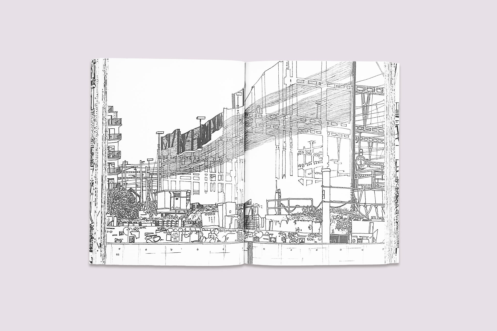 ドローイングは、小さなノートにフェルトペンで描かれた。何時間もかけてその場で描かれたドローイングは、瞑想にいざない、都市空間をさまざまな方法で知覚させる。