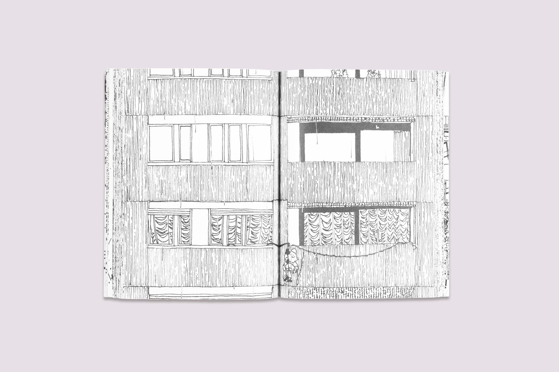 The drawings were made with felt pen in small notebooks. The hours-long work on the drawings, which are all made right on the spot, displaces Giezendanner into meditation and lets him perceive the urban space in different ways.